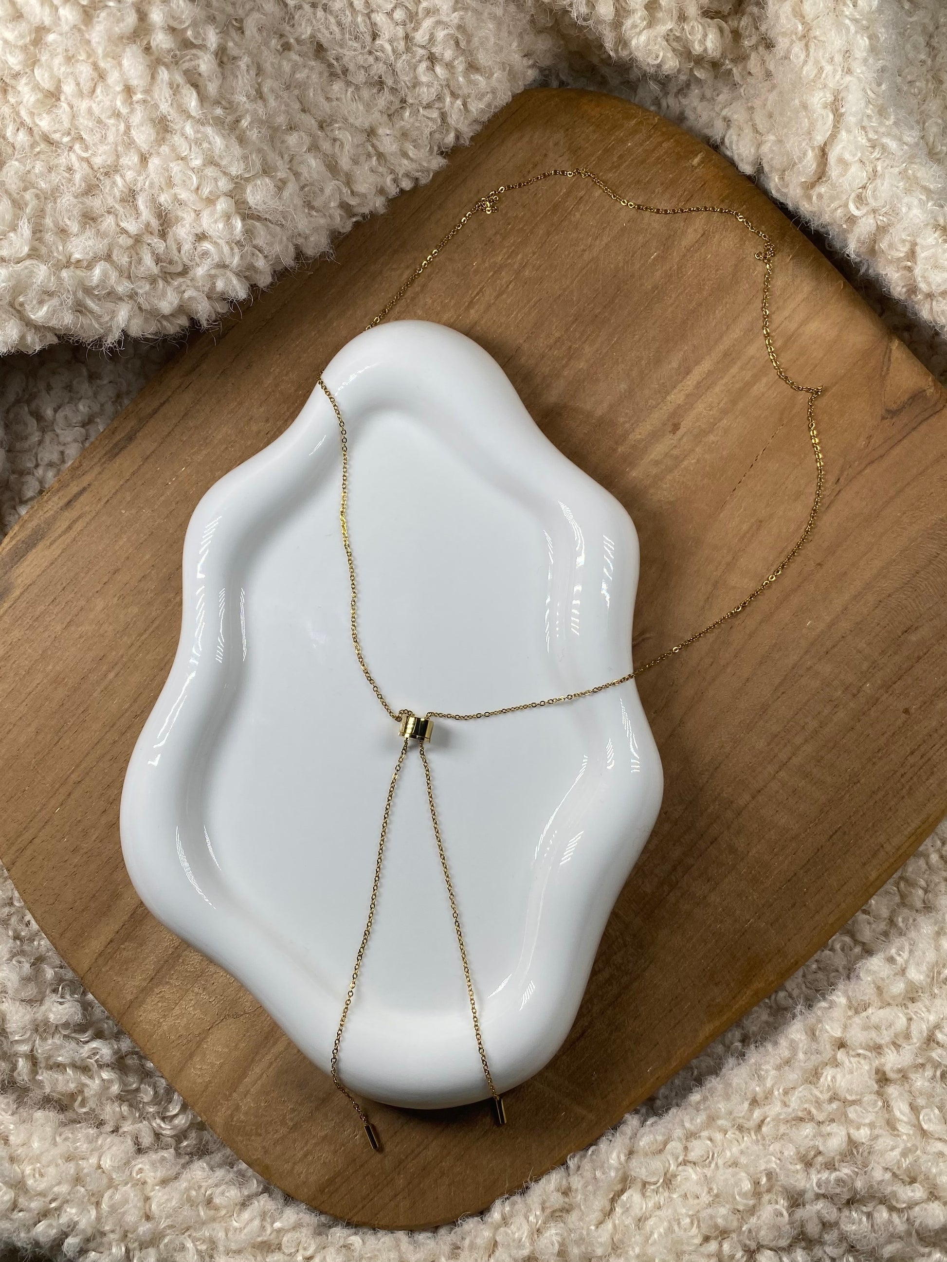 Collier cravate composé d'un cylindre coulissant et de deux tubes en bout de chaîne.